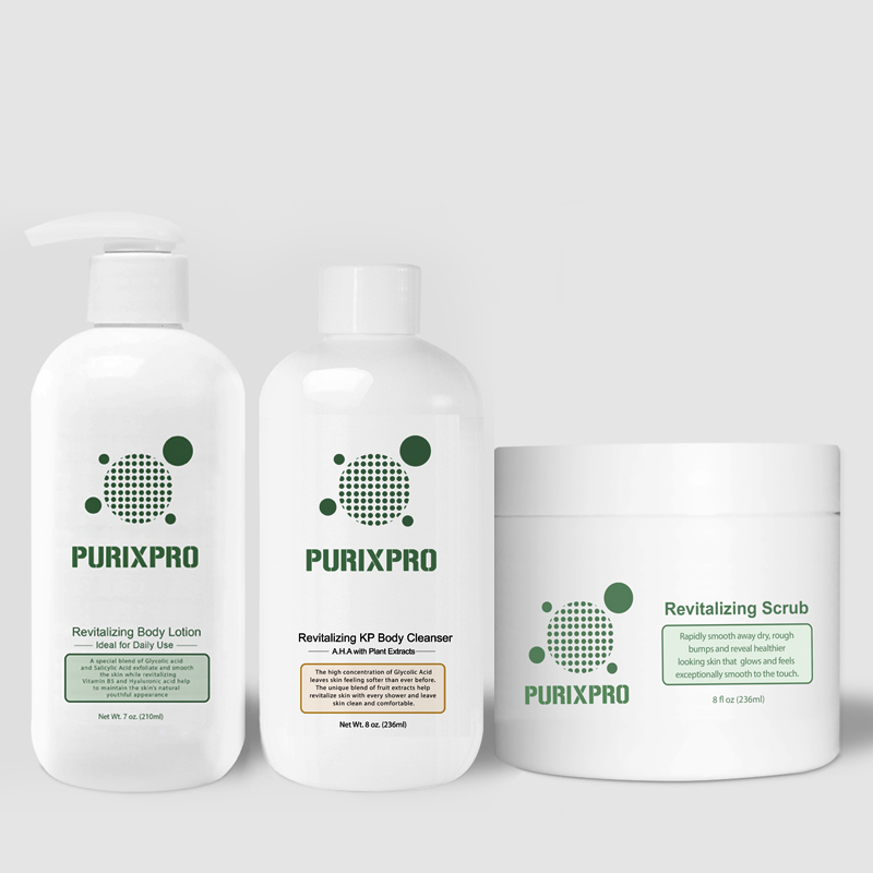 Revitalizes skin with every shower and even skin tone, texture. This Glycolid Acid 3-step kit includes Purixpro Revitalizing Body Cleanser, Revitalizing Scrub and Revitalizing Body Lotion.